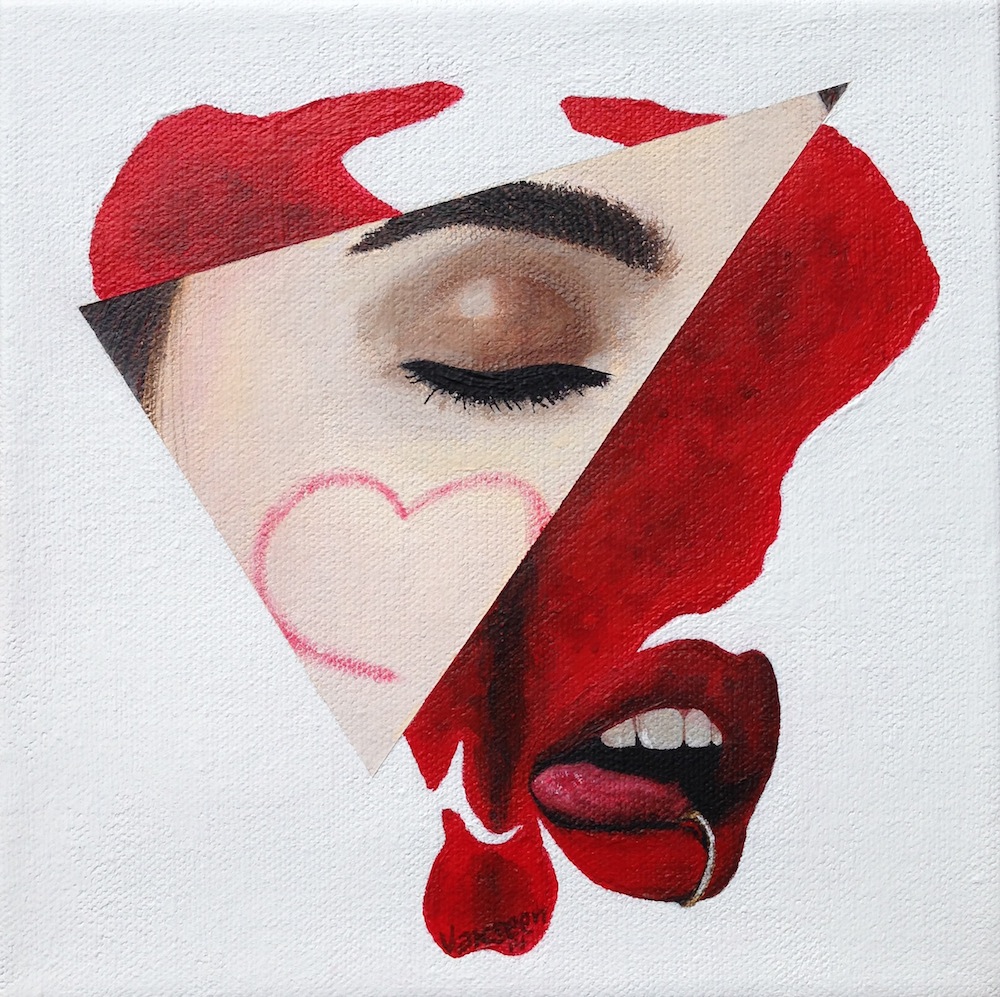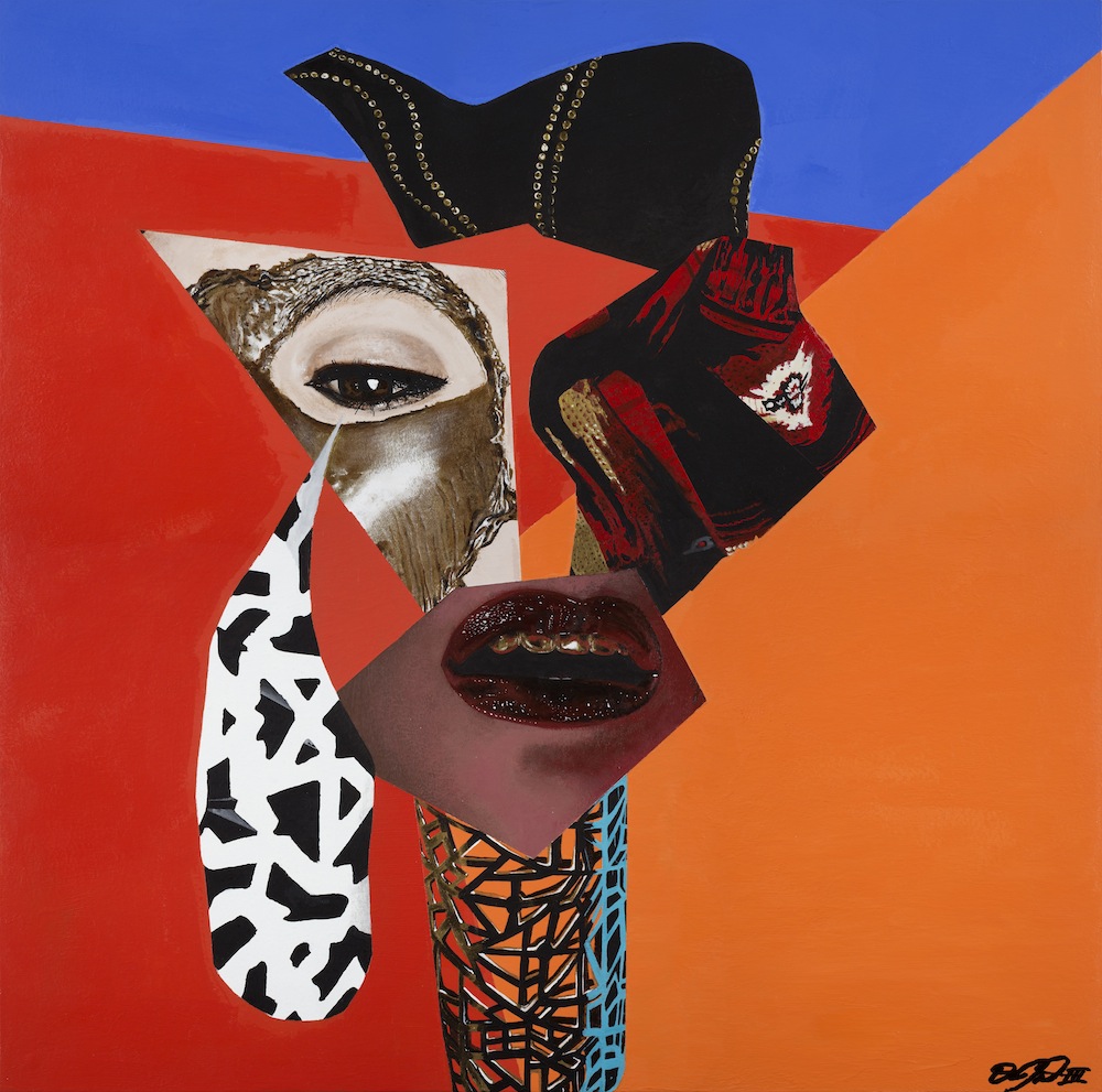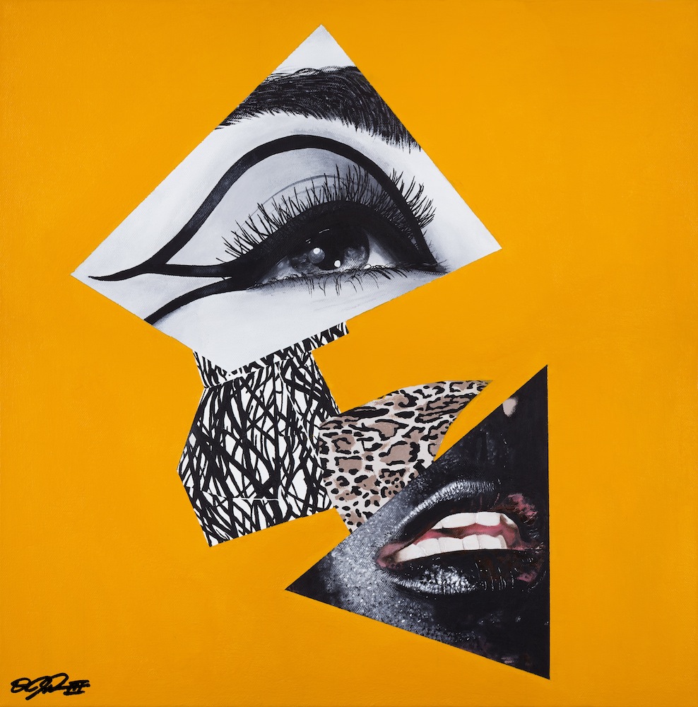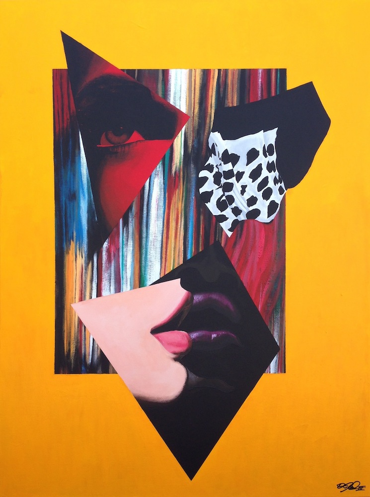 If I have to label it, my art falls under the surrealism category. I’ve created a signature style that fuses elements of photorealism, cubism and fashion design. Each painting is a unique portrait of an insecure soul with an incredible story to share. This clearly defines the base of my work; however the method is more complex. I attack my creative process the same way a cosmetic surgeon would. I use high end fashion and beauty magazines to clip and surgically collage the perfect features together, bringing my ideas to life. From this point I recreate everything by drawing, then painting these beautifully insecure souls onto the canvas. Initially, I would create using both acrylic and oil or water color paint. Now, I solely work with acrylics. My pieces come to fruition quickly, so I love the flexibility, depth and complex layers acrylic paint allows for. Vibrant color is my preference so my pieces tend to be loud, sensitive and vivacious. Colors demand attention. They play with our senses and evoke emotion responses within the human mind. I use that to my advantage. The colors are essential to the complete story of each creation.