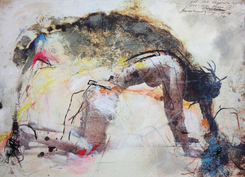 “I have painted two pieces for the show—Life Wishes Me Dead and Perpetual Struggle. Life Wishes Me Dead is a travelogue. Destinesia is the final stop. A hard and complicated life is tattooed on her skin, and it has marked her deeply, into her soul. Life tries to kill us every day. The important thing is not to drown. Perpetual Struggle tells of the endless fight between good and evil, between confidence and despair, between yes and no, often at the core of the creative process. Such conflict is a whirlwind at the center of Destinesia.â€