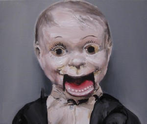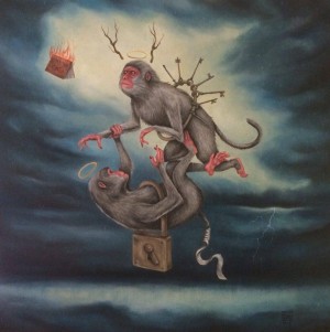 The woman sprouting knives in Mark Gleason’s “Emily,†the metallic winged creature in Robert Steven Connett’s “Planktonauts IV,†the fox fighting off crows in Sandy Yagi’s cutaway skull, the dislocated puppet mouths and painted eyelashes of Santiago Ydañez’ two doll paintings, the naked mysticism of Stephen Cefalo’s work for the show, the human-piloted chicken vehicle breathing fire in “Chicken of the Hills†by Tom McKee, and the mysteriously moving Godhead of “DancingGodComplex†by Victor Rodriguez. I am drawn toward these flames. These ideas bond Destinesia.