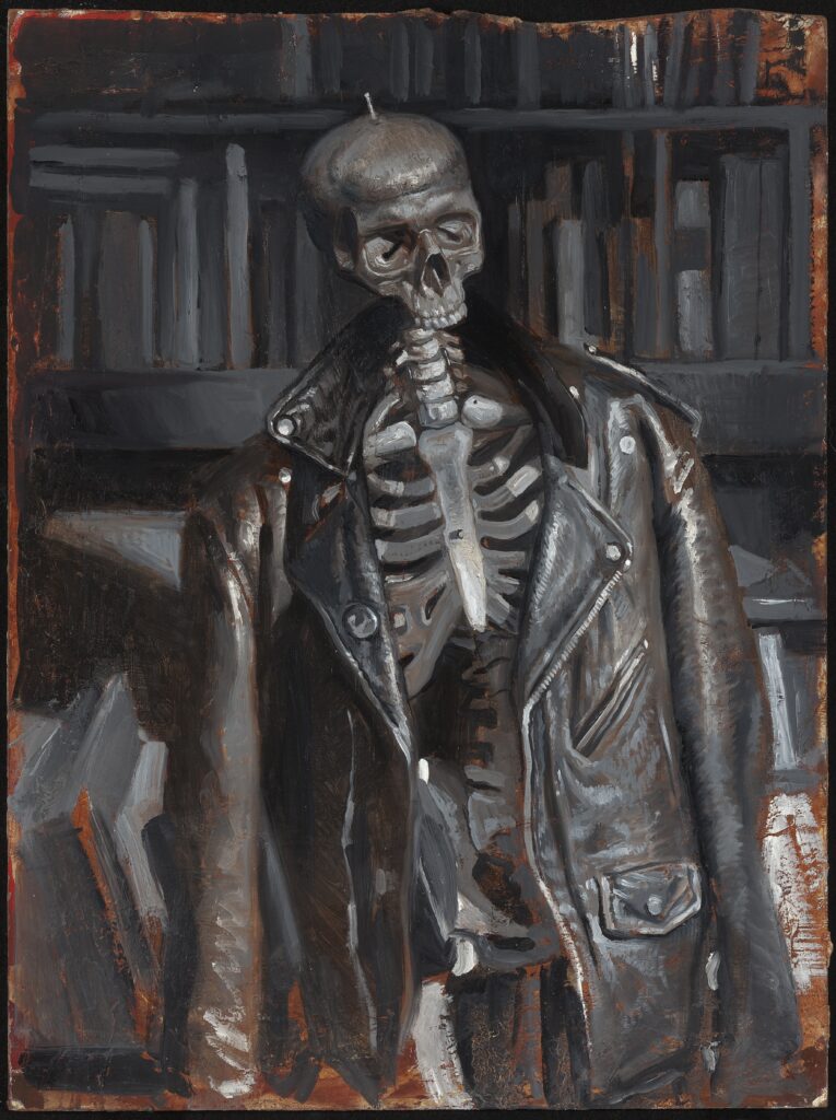 Sandy says, “Science, zoology, human folly and an obsessive curiosity for the macabre provide the fuel for my subject matter. My work is inspired by the natural sciences as well as by the traditional drawing and painting techniques of the old masters, including anatomical studies by artists such as Andreas Vesalius and Bernhard Siegfried Albinus. My recent paintings incorporate anatomical imagery to explore the human psychological condition and humanity’s effect on the natural world. Conjoined twin skeletons contrast figures with a natural deformity undertaking great feats of athleticism and grace. Hybrid creatures result from the use of art and fantasy to play with the principles of genetics and evolution.â€