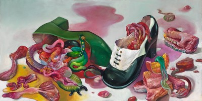 From his bio: “I paint figures, focusing on the little bits that obsess me…a little flab hanging over a waistband, ill-fitting shoes, overbites, noses, teeth, and flesh. Either through portraiture or busy tableaux, I create a world and vocabulary of characters that live and embrace their so-called faults. Over the years, this work has developed into piles that are corpulent and visceral stand-ins for characters. Meat, junk, pasties, and genital-like fruit and vegetables are constructed into heroic yet pathetic towers. These piles also act as a sort of forensic evidence and cataloging of awkward sex, gross gluttony, ridiculous masturbation rituals, and endless humiliation and failure. The work is absurd, grotesque, and a bit brutal, but I try to bring the viewer in with lush and glowing surfaces, creating a disorientating and hilarious balance of revulsion and attraction.â€