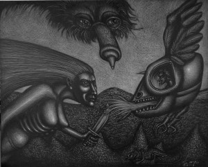 Illinois’ Tom McKee is an astonishingly articulate storyteller. His visionary ink-and-prismacolor drawings are highly personal and intuitive self-examinations that suggest we harbor savage instincts and unspeakable secrets.