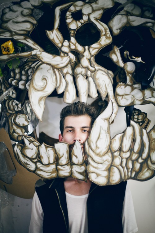 What do you use to create? While I can’t specify a medium I can certainly tell you what I use to create. I’m really into trash. Specifically industrial waste/scraps/leftovers and the possibilities therein. I’m really interested in a Baroque sense of drapery, folds upon folds upon folds, aesthetic elegance/ornateness. However, I tend to find this in the mundane, the wasted. I’m excited by the uncanny valley that is created when two polar opposite aesthetics (garbage and Baroque sensibilities) combine to create an object or a space that is at once beautiful and full yet also derelict and uncomfortable. I think that puts the viewer in a really crazy place. I also love acrylic paint, spray paint, woodblock prints (there’s something really crazy about using a chisel to carve an image rather than just drawing it. Makes drawing seem wimpy. That said I’m also an avid drawer, but chisels, man.